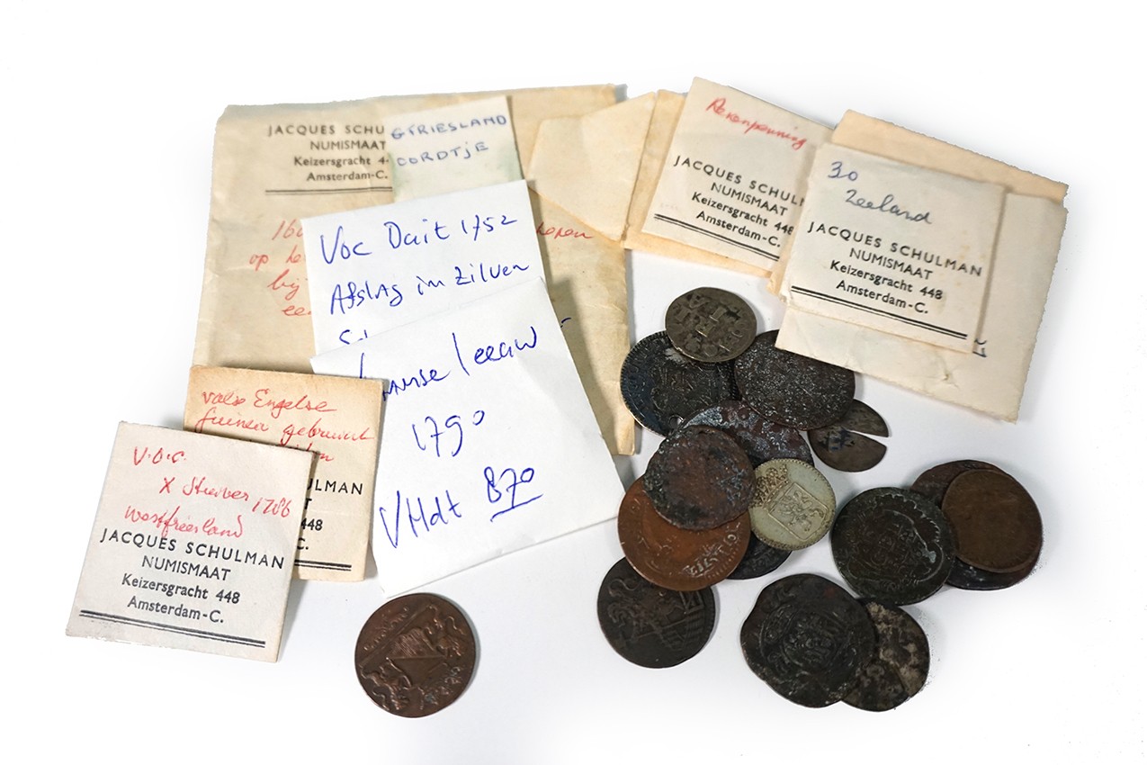 Blikje onuitgezocht koloniaal en provinciaal, o.a. VOC Duit 1752 afslag in zilver (Scholten 261) en Zilveren Leeuw 1790 Vlaanderen (VanHoudt 870).