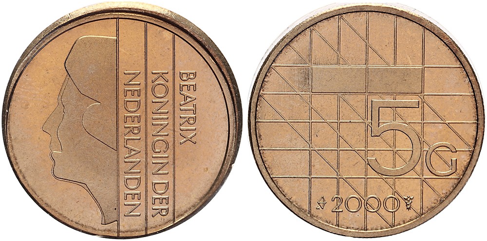 5 Gulden 2000, voorzijde decentrisch geslagen. [9,22 gram]. Unc.