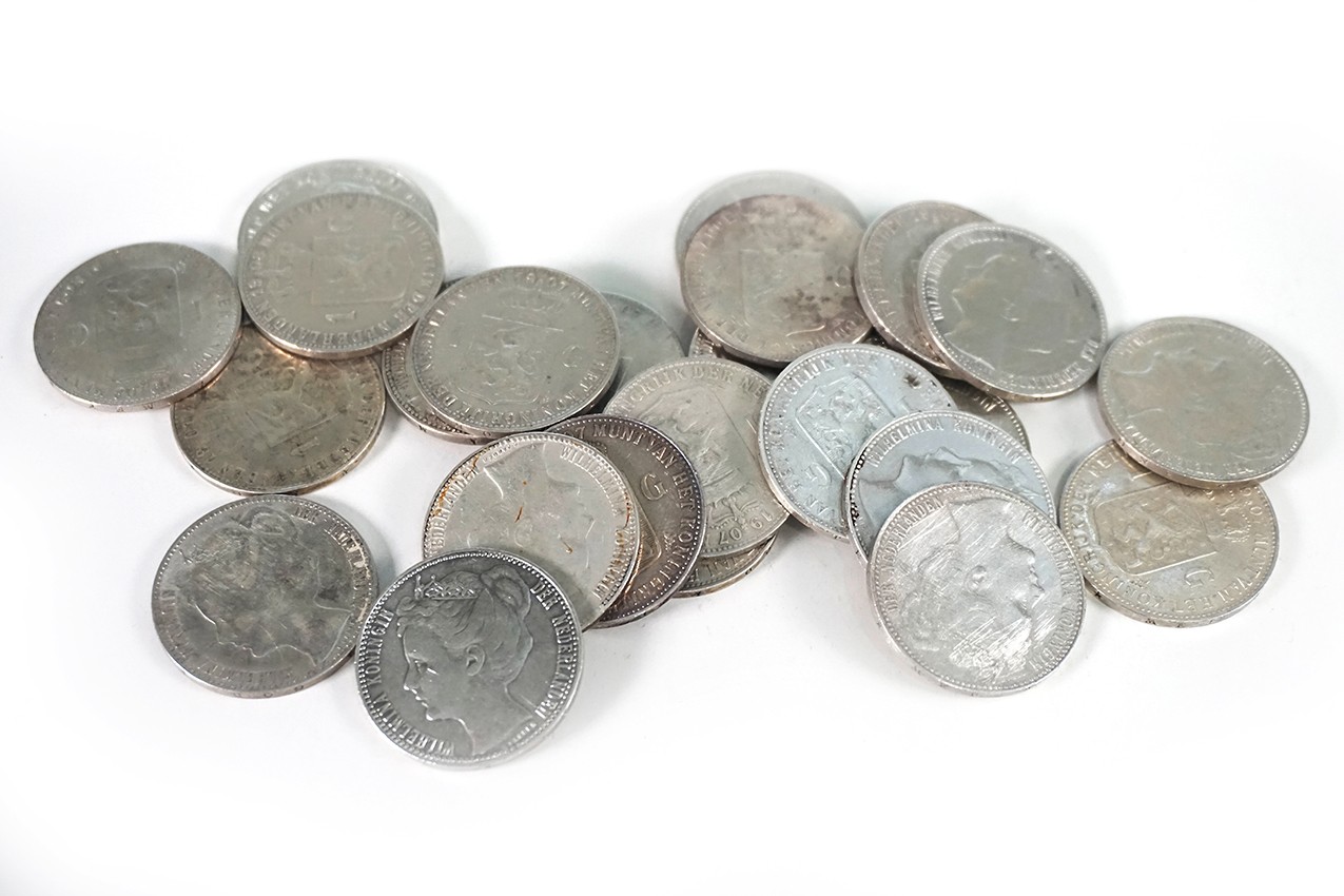 Wit doosje met 25 stuks 1 gulden Wilhelmina ‘kroningstype’; 1901 (2), 1904 (2), 1905 (1), 1907 (15) en 1908 (5). Diverse kwaliteiten.