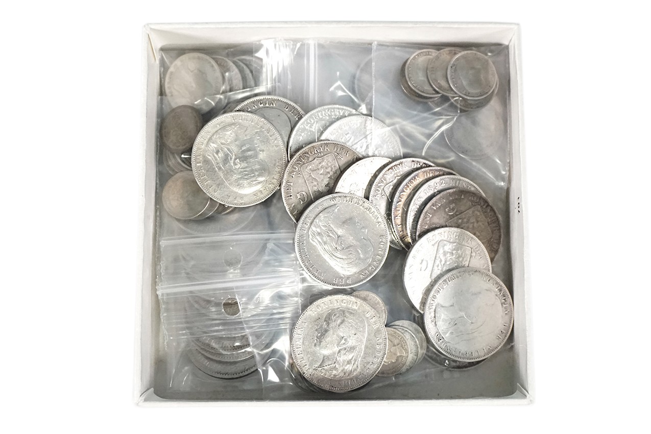 Doosje ‘Pimpernel’ zilveren Wilhelminamunten jeugdportret, inhuldigingstype en hermelijnen mantel (101). Dubbeltjes, kwartjes, halve- en hele guldens. Diverse kwaliteiten.