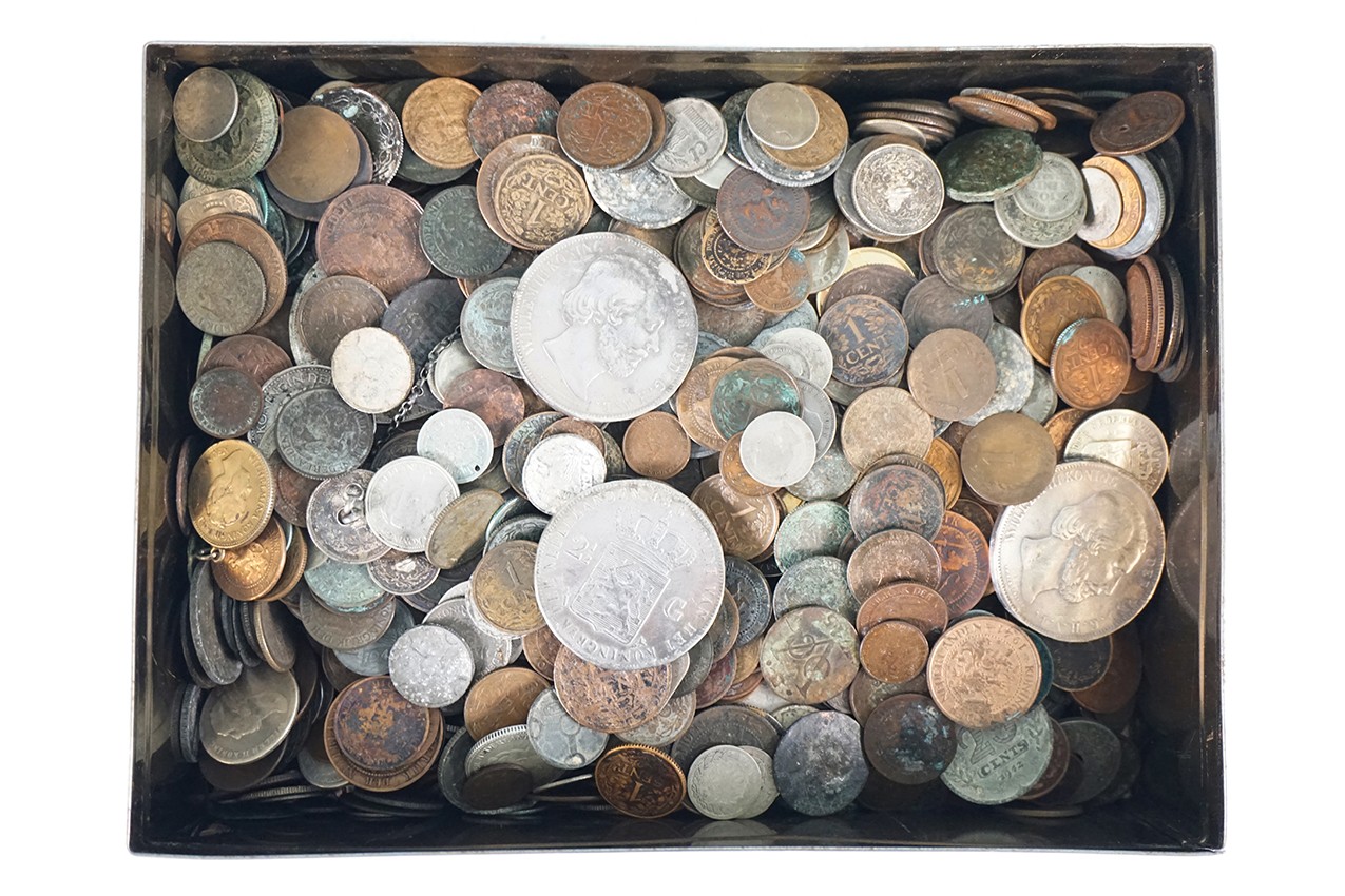 Blik met circa 4,1 kg. koninkrijks- en provinciale munten. Alles in slechte staat: verbogen, mishandeld, doorboord, gepoetst, gemonteerd, afgesleten, verkleurd, bekrast, verguld, gebutst, aangetast, gevlekt, brandblaren, uitgebaggerd of een combinatie hiervan……. Veel zilver.
