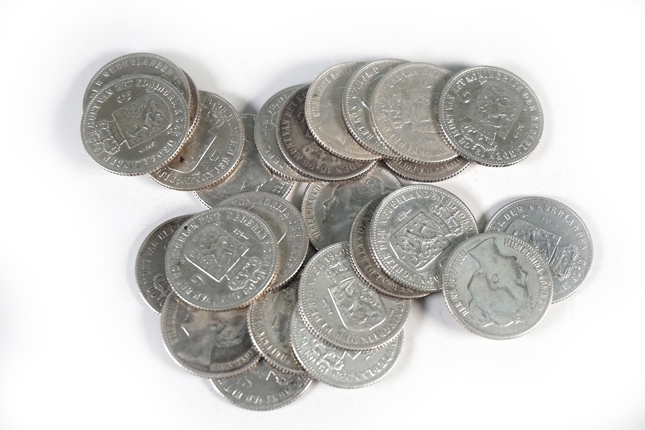 Bruin blikje met 25 stuks ½ gulden Wilhelmina ‘kroningstype’; 1898 (4), 1905 (7), 1907 (4), 1908 (8) en 1909 (2). Diverse kwaliteiten.