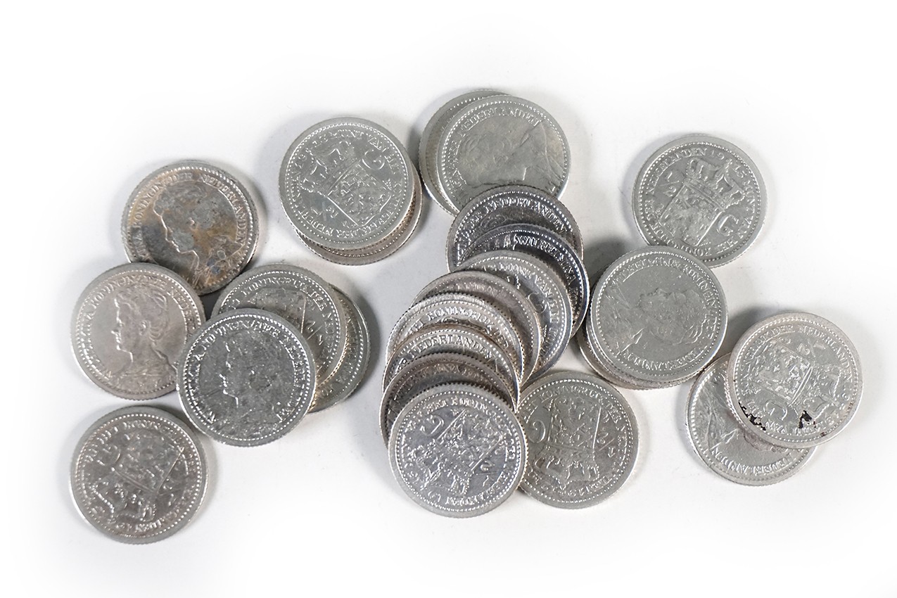 Zwart doosje met 25 stuks ½ gulden Wilhelmina ‘hermelijnen mantel’; 1910-1919. Diverse kwaliteiten.