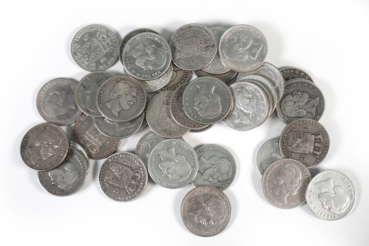 Bruin doosje met 40 stuks ½ gulden Willem II (5) en Willem III (35). Diverse kwaliteiten.