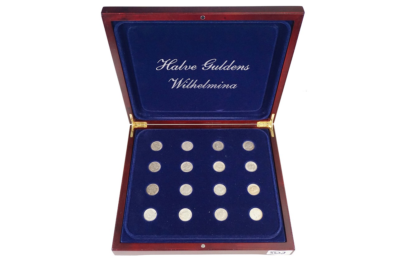 Fraaie houten cassette “Halve Guldens Wilhelmina” met 16 stuks tussen 1898 – 1930, compleet. Uitg. Het Nederlandsche Muntenhuis. Gemiddelde kwaliteit: zeer fraai.