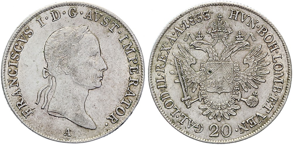 20 Kreuzer 1833A. KM 2147. Jahreszahl im Stempel aus 1832 geändert. Sehr schön.