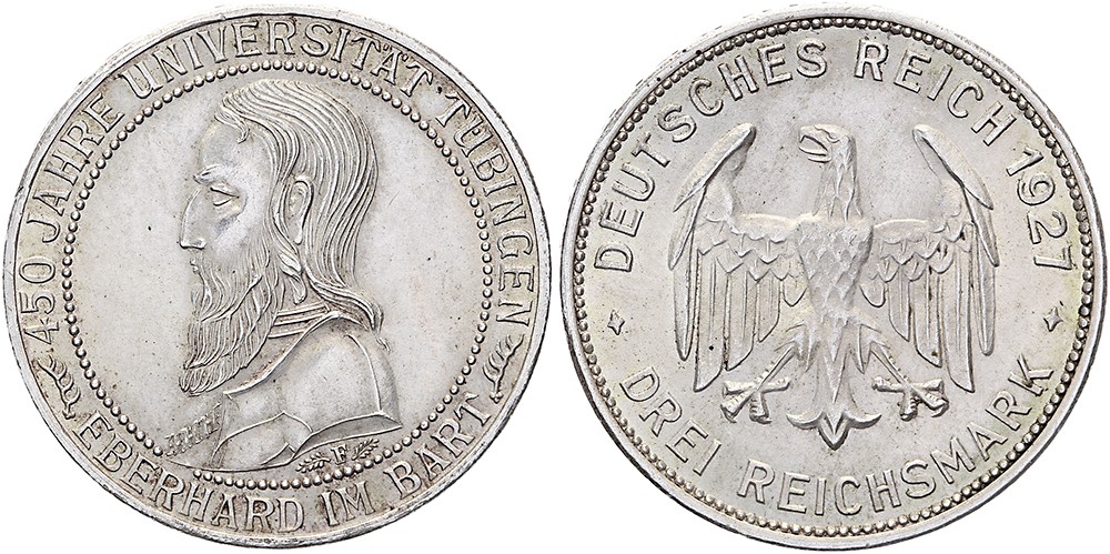 3 Mark 1927 Universität Tübingen. J. 328; KM 54. Vorzüglich.
