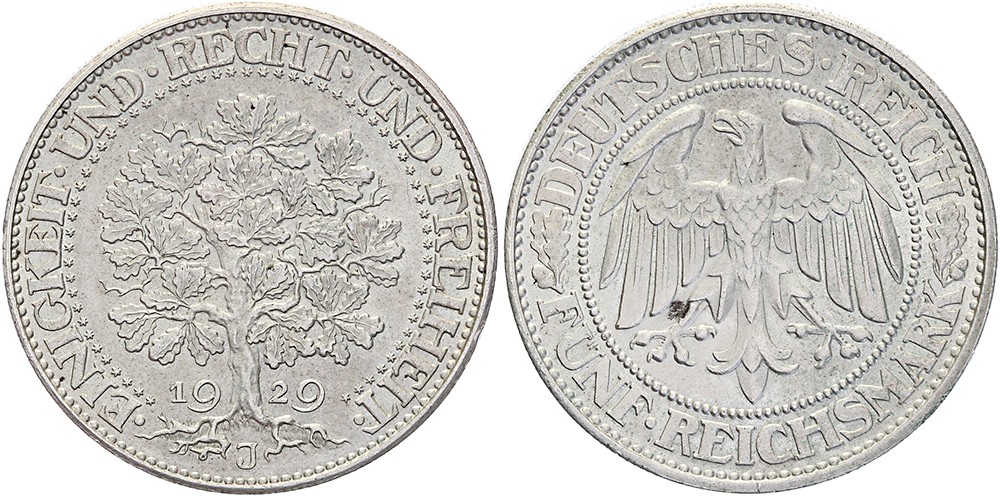 5 Mark 1929J Eichbaum. Jaeger 331; KM 56. Minimale Krätzer Rs., sonst gutes vorzüglich.