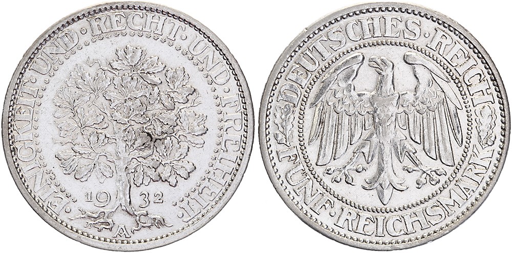 5 Mark 1932A Eichbaum. Jaeger 331; KM 56. Saubergemacht. Sehr schön / vorzüglich.