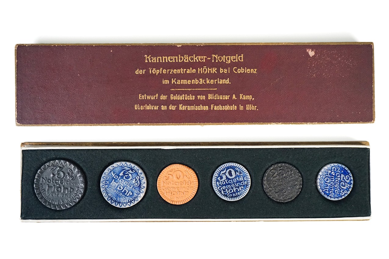 Kannenbäcker-Notgeld 1921 der Töpferzentrale Höhr bei Coblenz im Kannenbäckerland. Entwurf der Geldstücks von Bildbauer A. Kamp, Oberlehrer an der Keramischen Fachschüle in Höhr. Sehr schön.