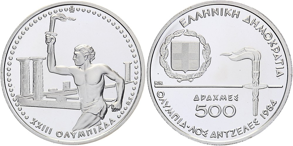 500 Drachmes 1984 Olympics. KM 145. Proof.