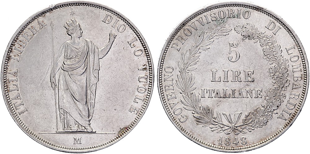 5 Lire 1848M Revolution. KM C22.3; MIR 527.2. VF.