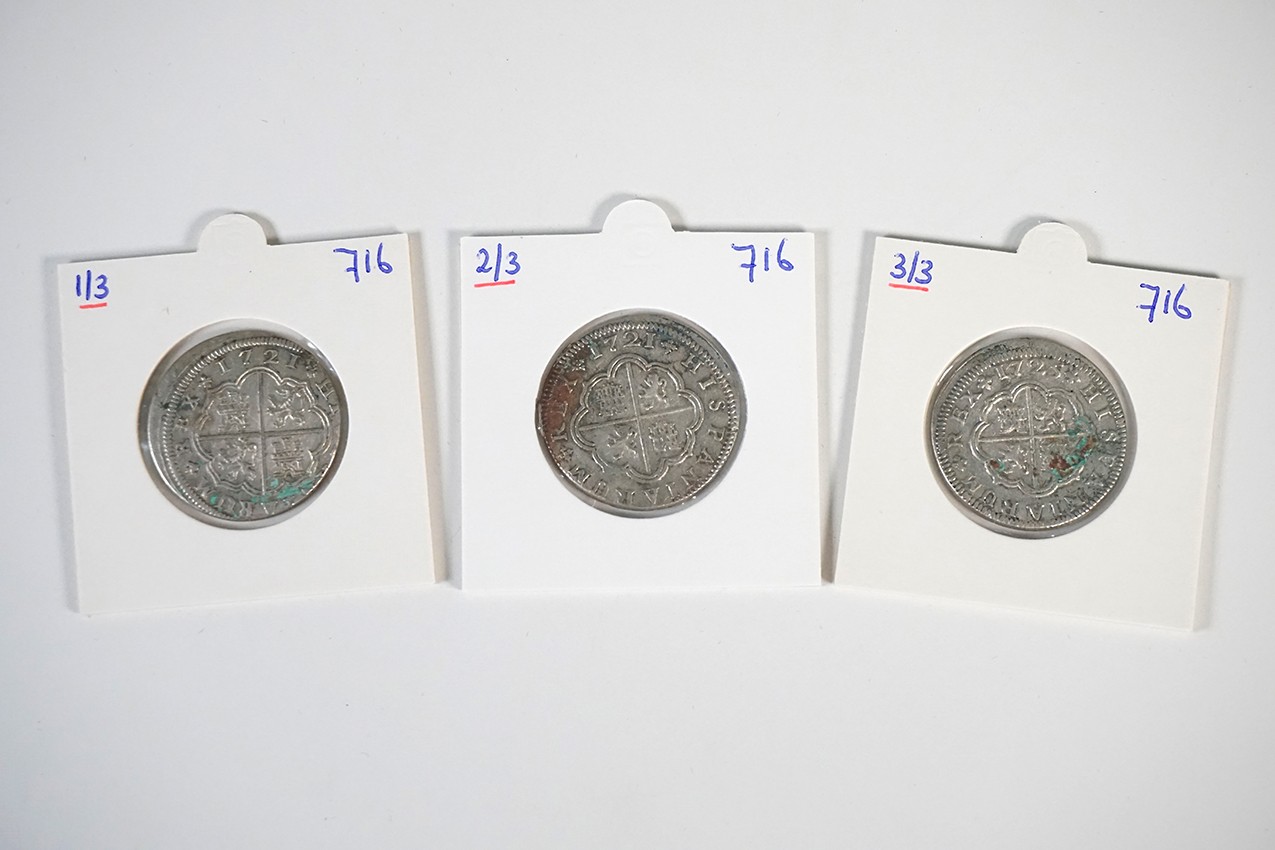 Lot (3) II Reales 1721 Madrid, 1721, 1725 Sevilla. KM 296, 307. Corrosion spots. VF / EF.
