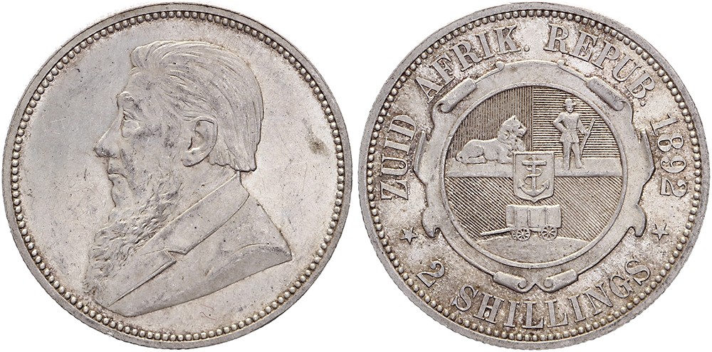 2 Shillings 1892 Paul Kruger. KM 6. Apart from a minuscule edge nick a nice uncirculated coin with lovely toning.