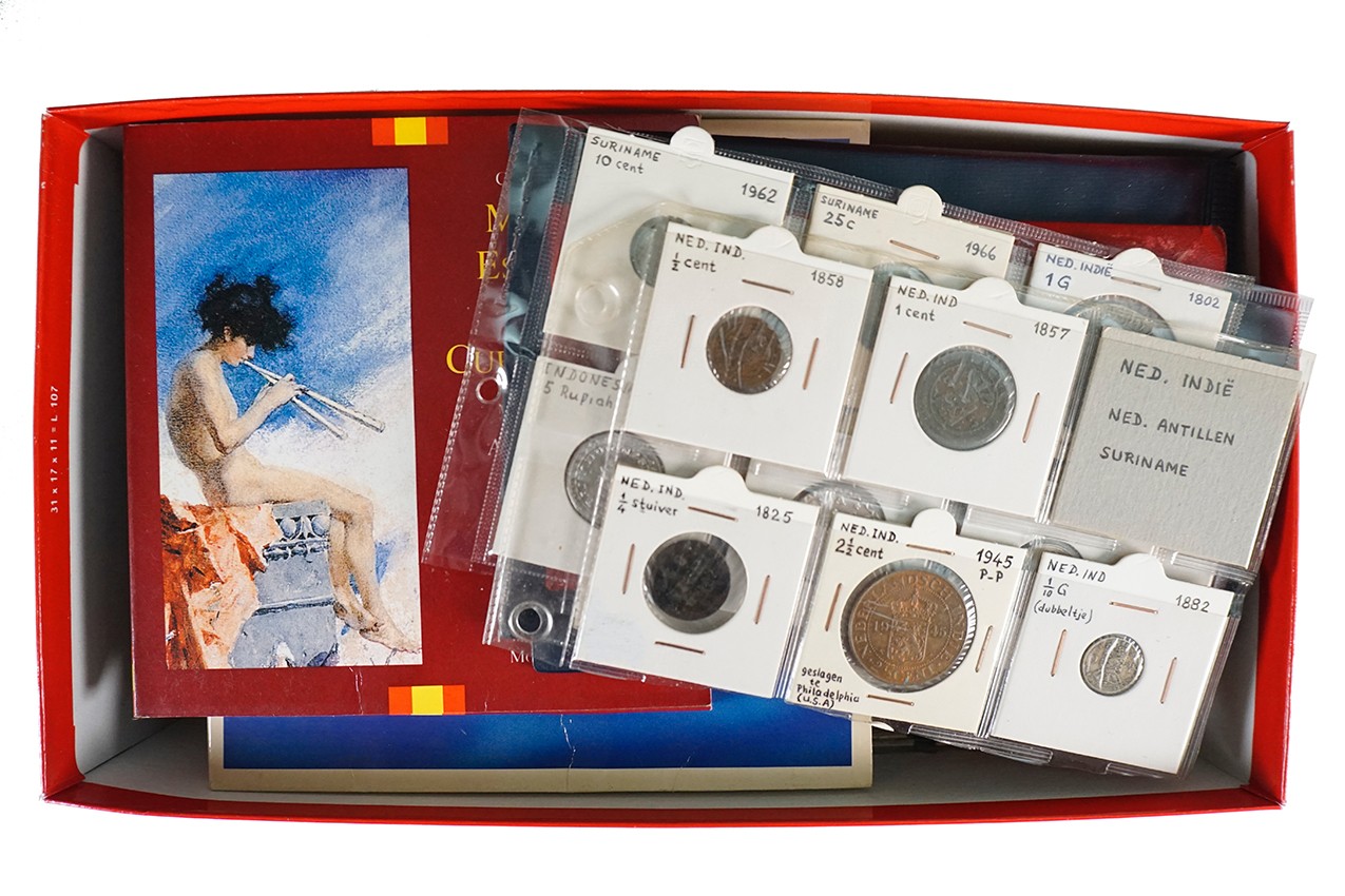 Doos met daarin kistje wereld vnl. kilogoed en koersgeld. Ca. 5000 gram.