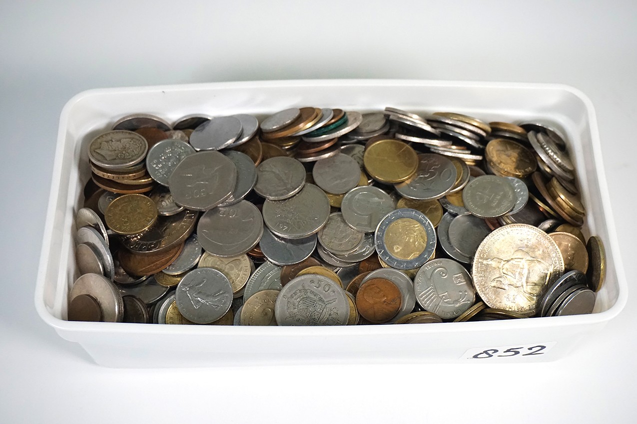 Langwerpig plastic Curverbakje met 5 kg. eenvoudige wereldmunten, kilowaar.