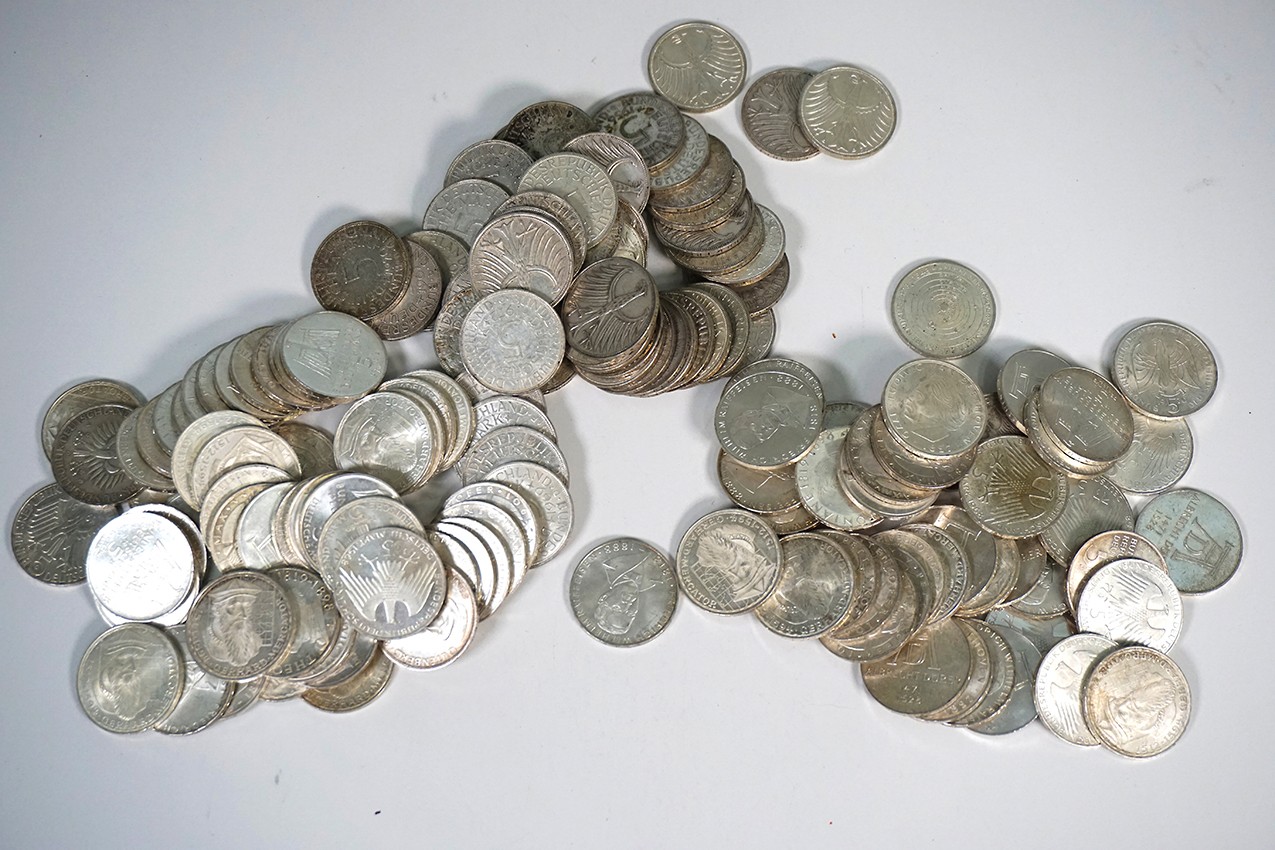 Sigarenkistje zilveren 5-mark stukken Duitsland (150), waarvan 50 x type Jaeger 387 en 100 x herdenkingsmunten. Netto zilver: circa 1050 gram.