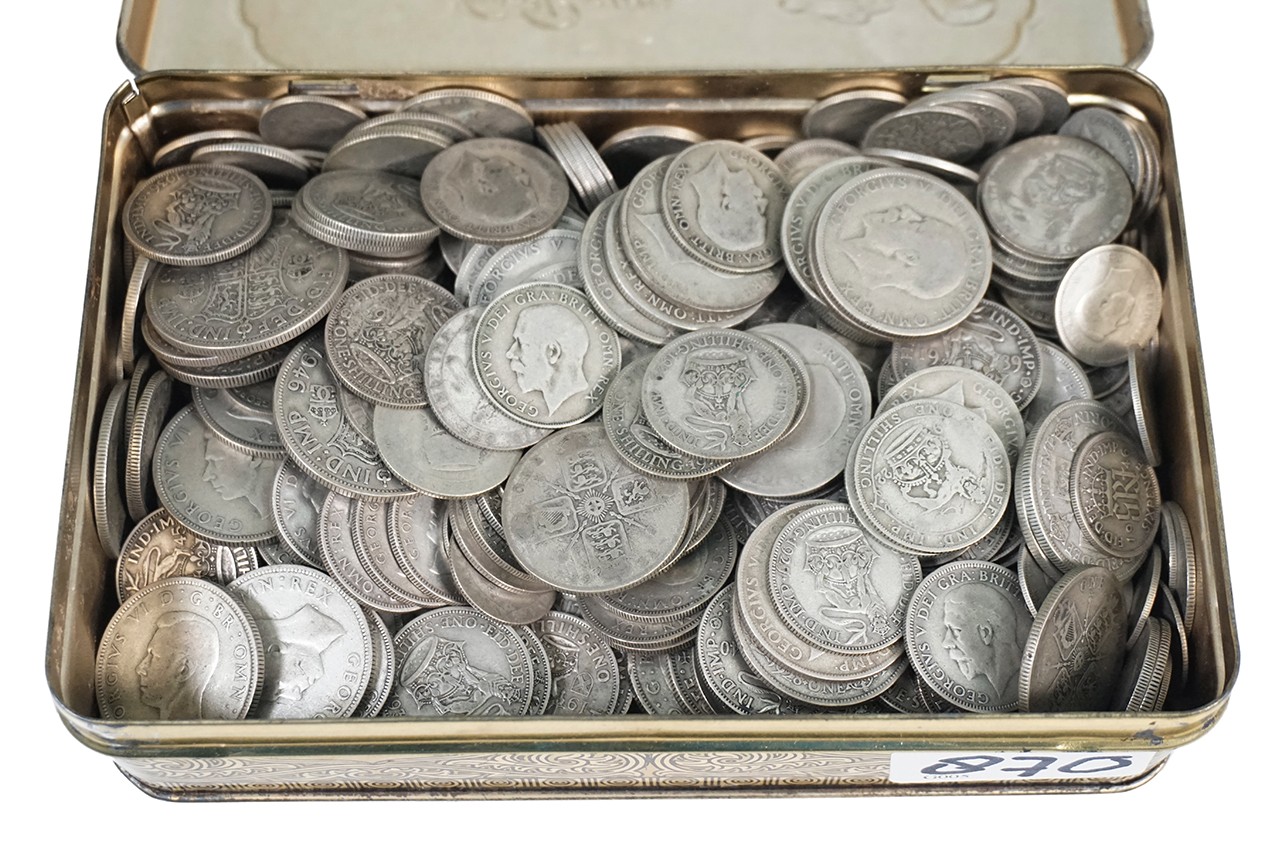 Engeland. Tjoklat pastilles blikje met sixpences, shillingen, florins en halfcrowns George V en VI. Netto zilver ± 1175 gram.