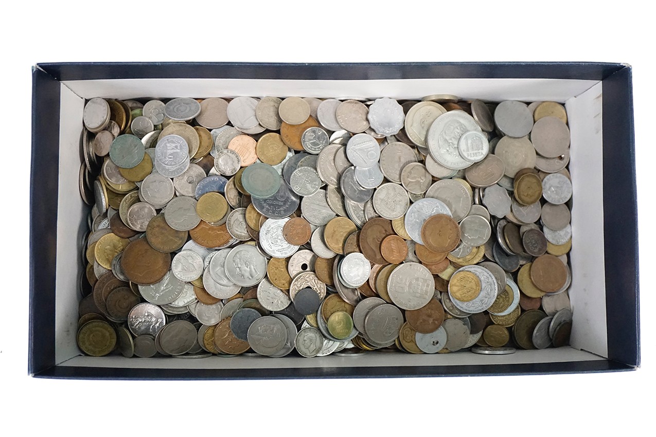 Schoenendoos met 7 kg. eenvoudige wereldmunten, kilowaar.