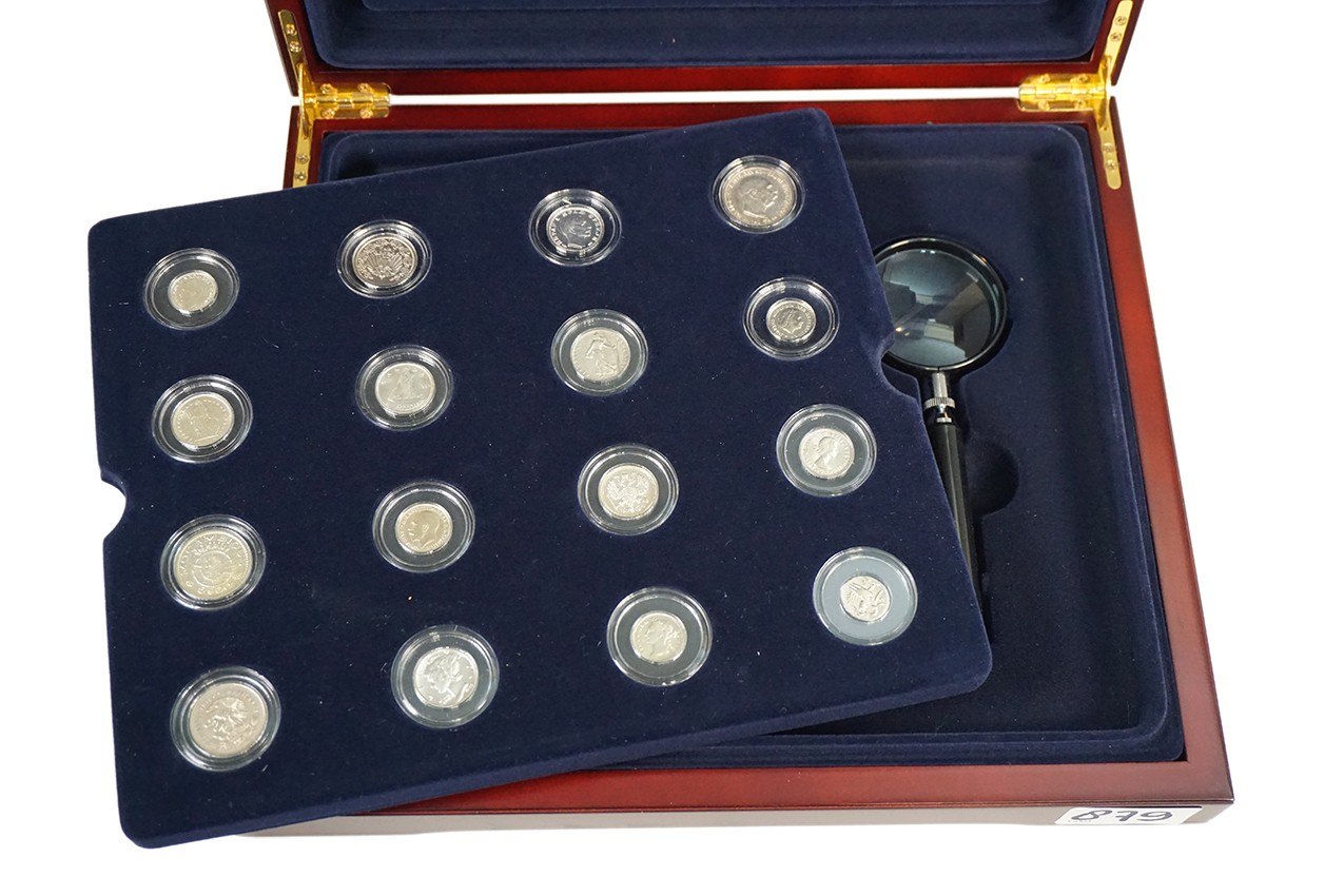 Fraaie houten cassette “Kleinste Zilveren Munten” met 15 kleine zilveren wereldmunten en, gek genoeg, een nikkelen dubbeltje. Uitg. KNM met certificaten.