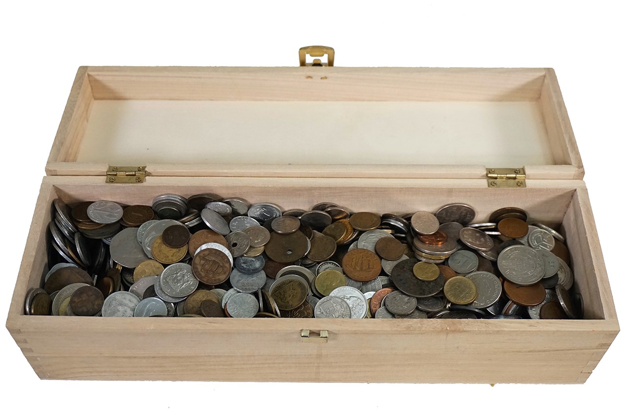 Langwerpig houten kistje met 6 kg. eenvoudige wereldmunten, kilowaar.
