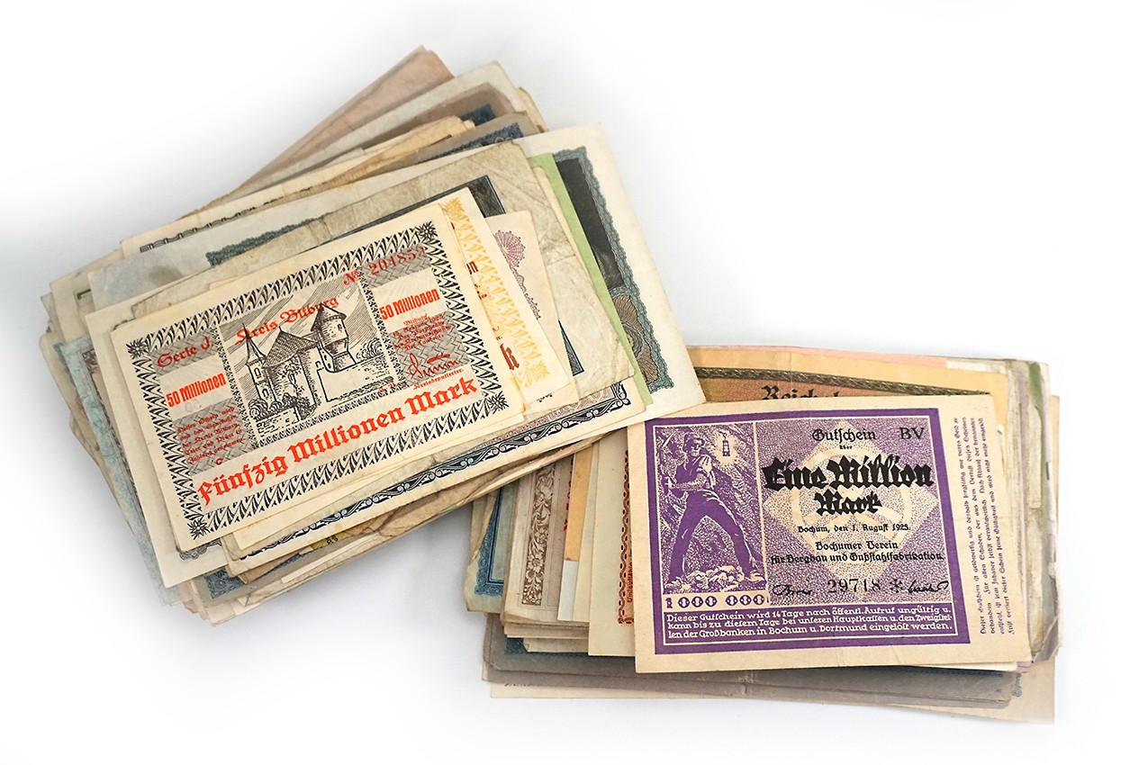 Doos met honderden biljetten uit de inflatieperiode in Duitsland.