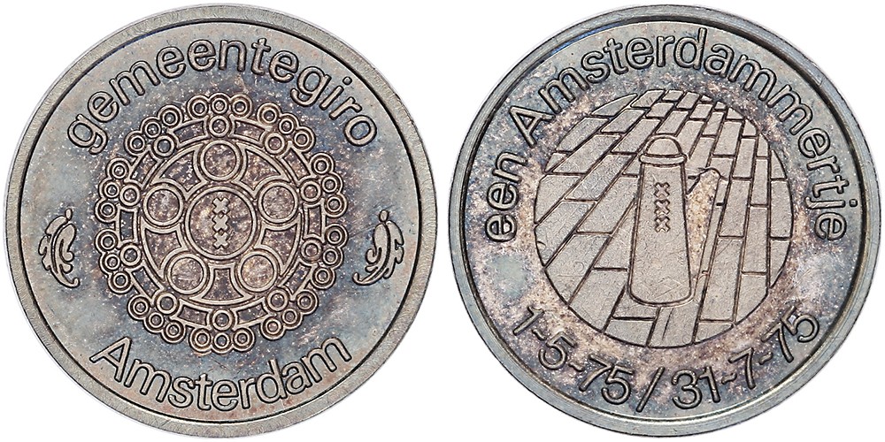 1975 Amsterdam, tentoonstelling ‘Florin 75’. Logo gemeentegiro. / Straatpaaltje, z.g. ‘Amsterdammertje’.AR 20 [3,4 gram]. De Kreuk/Mev. 41A; Kooij RZ 052.2. In originele verpakking. ProofN.B. De zilveren exemplaren [oplage: 50 stuks] werden uitsluitend vervaardigd voor personen die zich voor de tentoonstelling verdienstelijk hadden gemaakt.