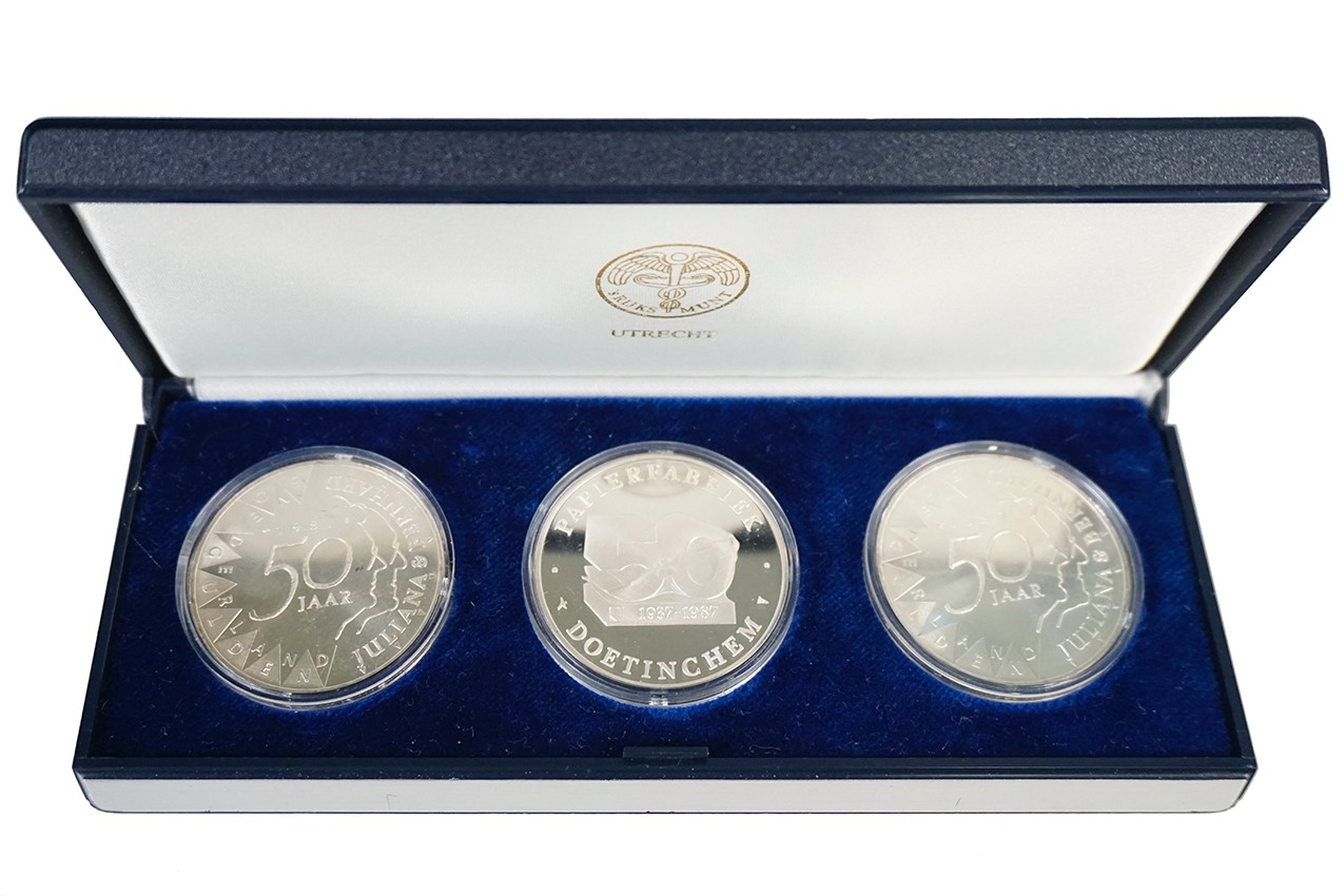 Lot (3) 1987 50 Jaar Papierfabriek Doetinchem. Groot getal ‘50’ half in papier verpakt. / ‘De Papiermaaker’ van Jan Luyken. AR 38. Proof. In langwerpige cassette met 2 x 50 Gld. 1987.