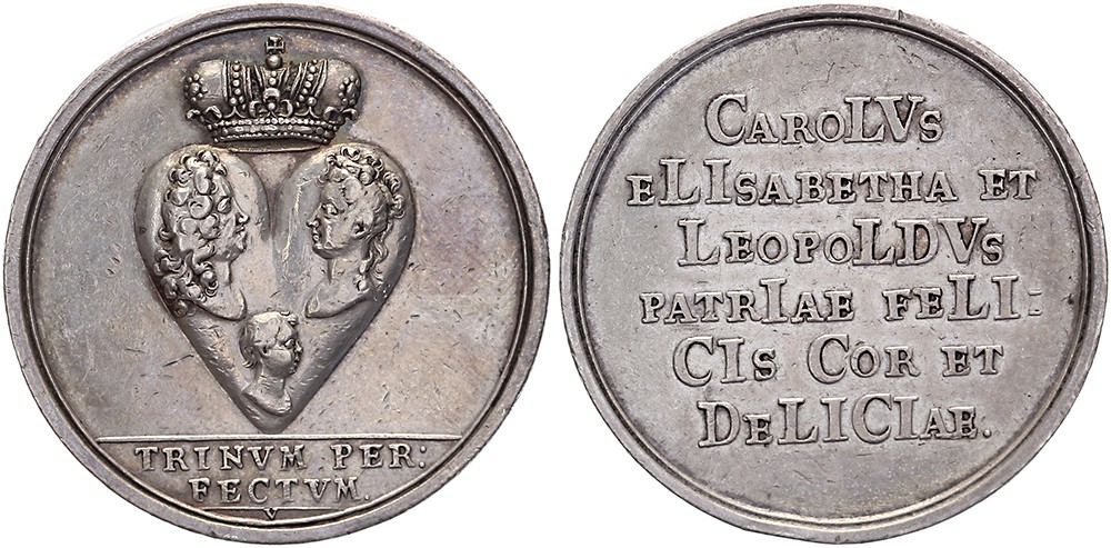 1716 Geburt Erzherzog Leopold. Ein gekröntes Herz, darin Brustbilder kaiserliche Familie. / Sechs Zeilen Schrift, Jahreszahl in Chronogramm. AR 32. Welzl 7590. (G.W. Vestner). Sehr schön.