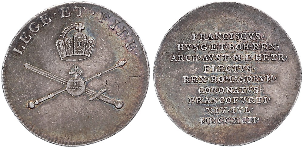 1792 Krönung Franz II in Frankfurt. Kaiserkrone, darunter Schwert und Zepter gekreuzt, in der Mitte Reichsapfel, LEGE ET FIDE. / Neun Zeilen Schrift. AR 20,5 (Silberjeton). Sehr schön / vorzüglich.