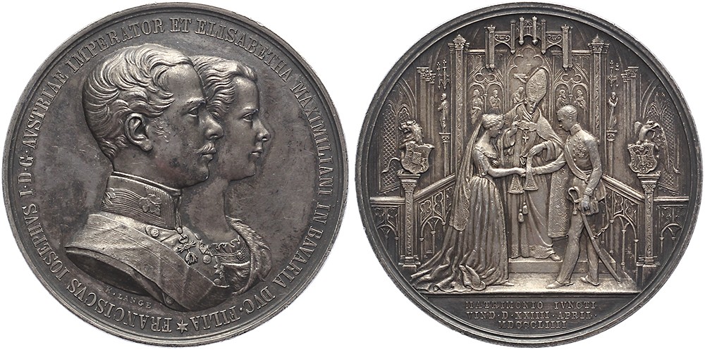 1854 Vermählung Franz Joseph mit Elisabeth von Bayern. Doppelbüste nach rechts. / Trauungsakt in der Augustiner Kirche in Wien, zelebriert von Kardinal Rauscher. AR 56. Horsky 3764; Hauser 297. K. Lange. (keine Randpünze). Vorzüglich.