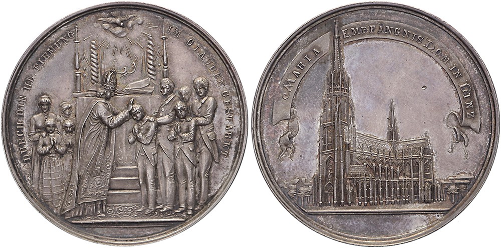 o.J. (um 1870) Durch die heilige Firmung im Glauben gestärkt. Firmungsszene mit Bischof und Firmanden. / Ansicht Linzer Dom. AR 39. Leo Zimpel. Vorzüglich.