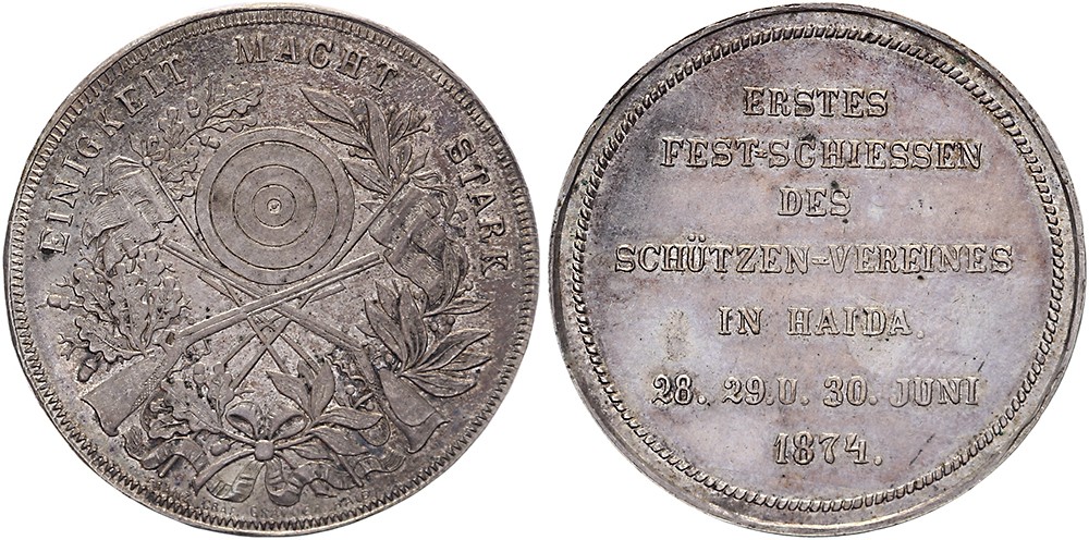 1874 Haida (im Mähren), I. Festschiessen der Schützenverein. Gekreuzte Waffen unter Zielscheibe. / Sieben Zeilen Schrift. AR 33. Franz Graf. Selten. Vorzüglich.