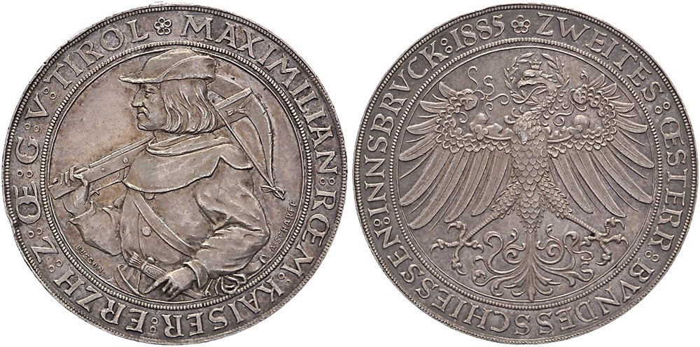 1885 Doppelgulden auf das 2. österreichische Bundesschiessen in Innsbruck. Maximilian mit Kreuzbogen. / Adler. AR 36. Busson / Scharff. Leichte Randfehler, Randpünze A. Vorzüglich.