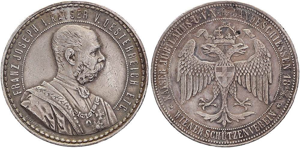 1888 Wien. Kaiser Jubiläums und 5. Niederösterreichisches Landesschiessen. Brustbild Kaiser Franz Joseph I nach rechts. / Gekrönte Doppeladler mit Wappen van Östereich als Hartschild. AR 36. Hauser 5146. F. Leisek. Randpünze A. Sehr schön.