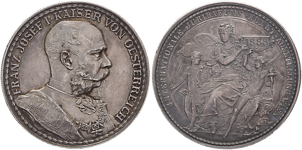 1888 Wien. Internationale Kunst-Ausstellung. Büste Franz Joseph I nach rechts. / Sitzende Ars umgeben von zwei Putti. AR 36,6. Wurzb. 2518; Hauser 2916. A. Scharff. Min. Randfehler Rs., Randpünze A. Vorzüglich.
