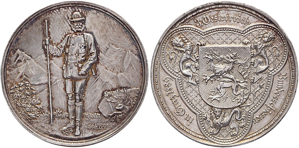 1889 Graz, 3. österreichisches Bundesschiessen. Kaiser Franz Joseph in Lederhose und Steirerhut vor Alpenlandschaft. / Wappen im Dreipaß. AR 36. H. Jauner. Leichte Randfehler. Vorzüglich.