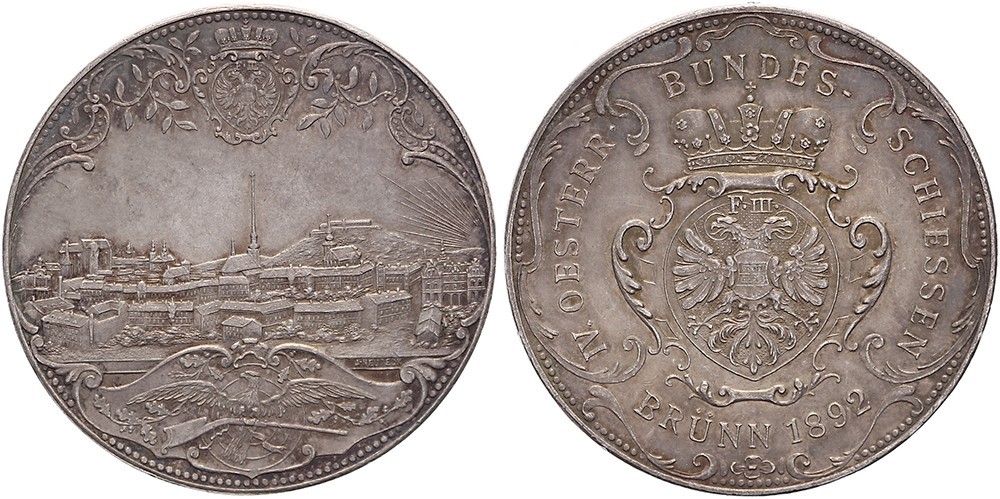 1892 Brünn, IV. österreichisches Bundesschiessen. Stadtansicht von Brünn. / Stadtwappen in gekrönter Kartusche. AR 36. Frühwald 2187; Hauser 5171. A. Neudeck. Randpünze A. Vorzüglich.
