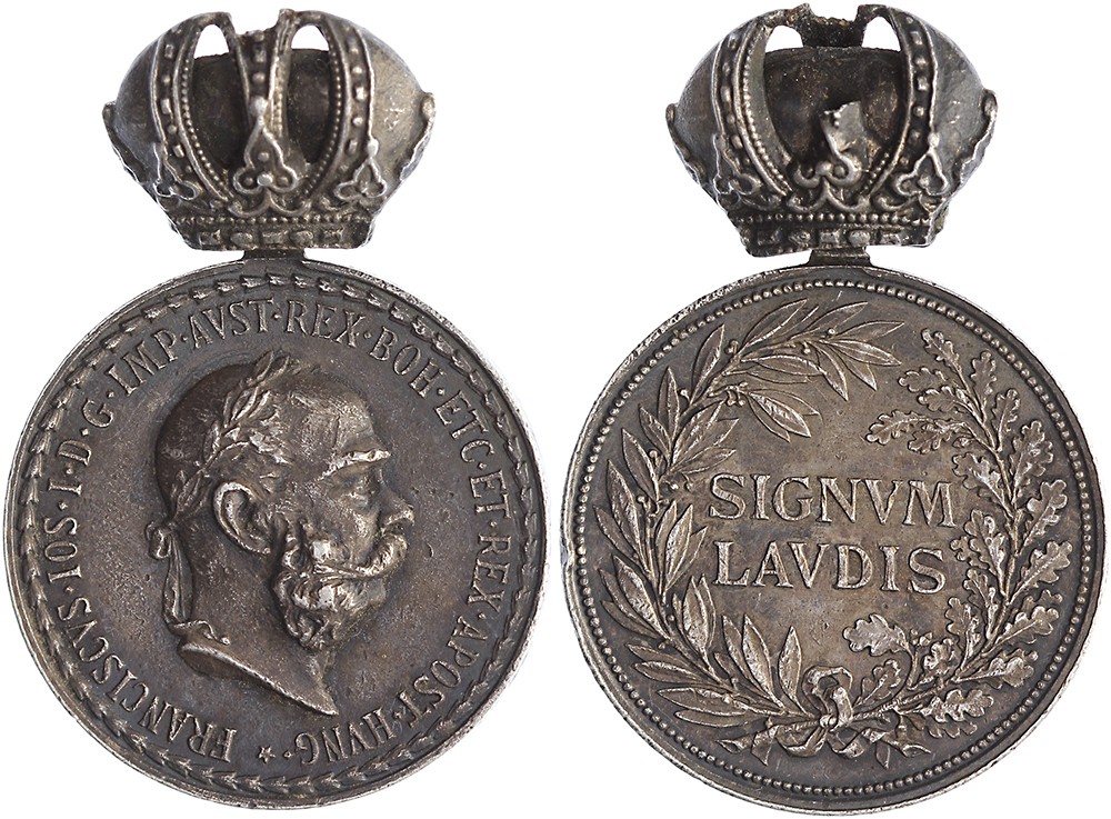 o.J. Milität-Verdiensmedaille. Kopf Franz Joseph I nach rechts. / SIGNVM LAVDIS im Kranz.AR 30,7. Ohne Bandspange. Randfehler Rs. Sehr schön.