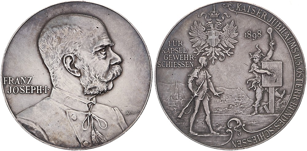 1898 Kaiser Jubiläums und 5. österreichisches Bundesschiessen. Buste Franz Joseph in Schützentracht nach rechts. / Stehende Schütze und Narr mit Zielscheibe. AR 37,3. A. Scharff. Randpünze A. Sehr schön / vorzüglich.
