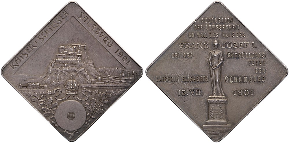 1901 Salzburg, Kaiserschießen und Enthüllung Elisabeth-Denkmal. Die Festung Salzburg über Zielscheibe. / Das Denkmal. AR viereckig 29,6 x 29,6 (Klippe). Peltzer 1910; Hauser 5111. Randpünze Kleeblatt und Rosette (?). Sehr schön / vorzüglich.