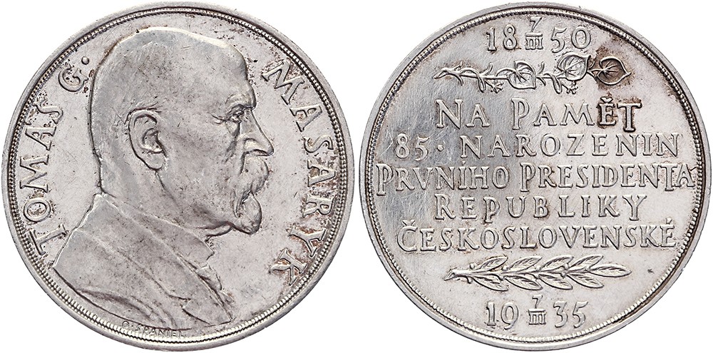1935 President Thomas Masaryk 85 years. Bust right. / Text. AR 42. O. Spaniel. EF.