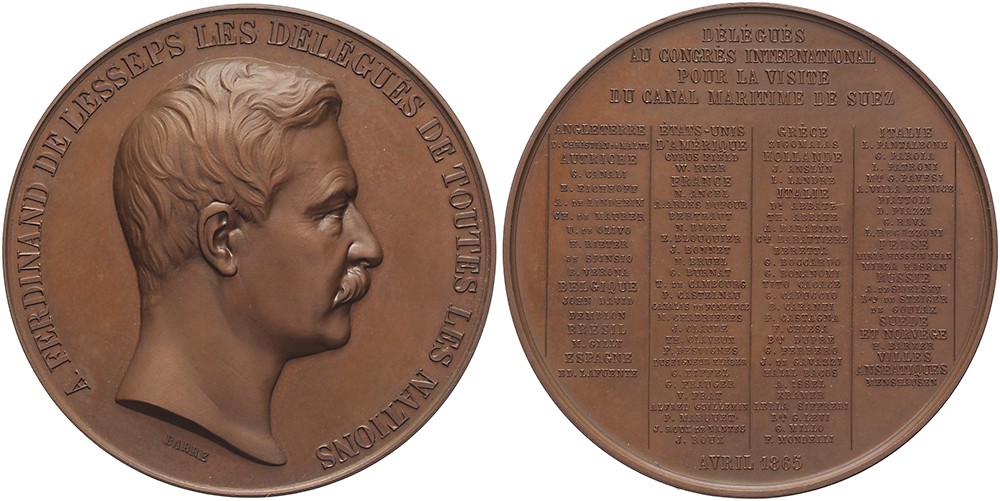 1865 Ferdinand de Lesseps et le Canal de Suez. Tête à droite de Ferd. de Lesseps. / En quatre colonnes, liste des délégueés des différentes nations, en exergue: AVRIL 1865Æ 60. MdP page 20B. D.-A. Barre. Boîte original. Presque FDC.