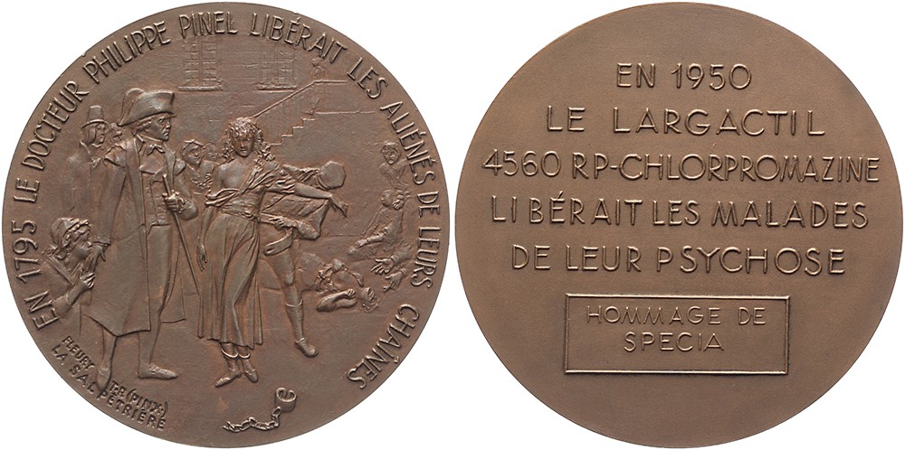1950 En 1795 Philippe Pinel libérait les aliénés de leurs chaînes. Le docteur debout en libérant les aliénés d’après une peinture de Tony Robert Fleury. / Text. Æ 67. Superbe.