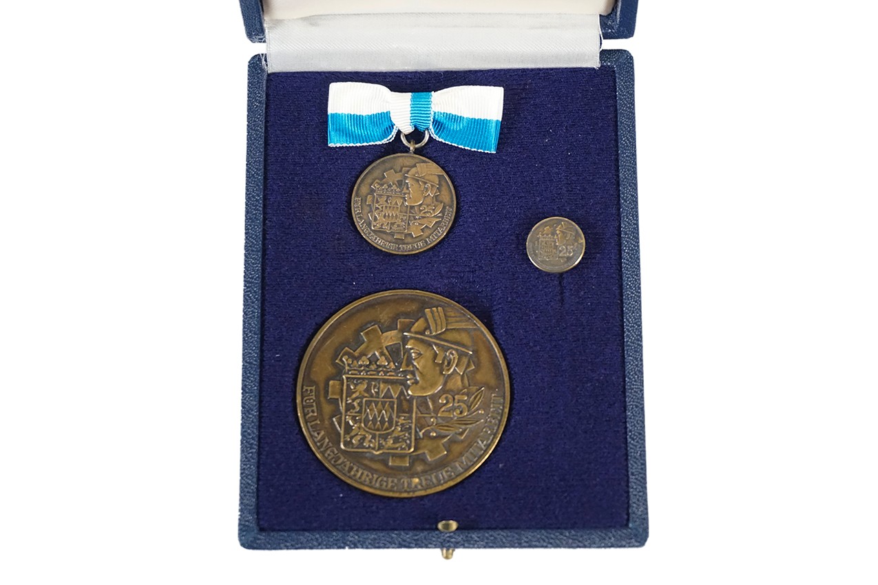 o.J. Dreiteilige Satz der Industrie- und Handelskammer für München und Oberbayern für langjährigen treue Mitarbeit. Æ 49,5 + 25 (mit Öse und Fahne) + 18 (Pin). Im Originaletui. Vz.