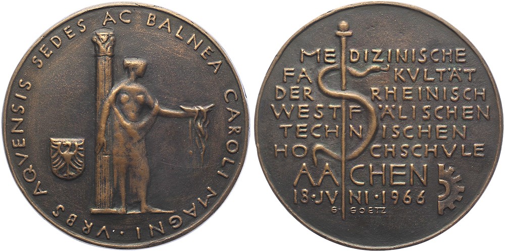 1966 Aachen. Eröffnung der Medizinischen Fakultät der Rheinisch Westfälischen Hochschule. Darstellung Hygieia neben einer Säule stehend. / Äskulapstab, Zahnrad und Schrift. Æ guss 85,5. Guido Goetz. Vorzüglich.
