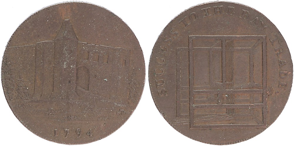 1794 Heath’s Colchester Castle weaving loom halfpenny. View of Colchester Castle (Essex). / Detailed representation of a large weaving loom. Æ 29 with edge inscription. D&H Essex nr. 10. EF.