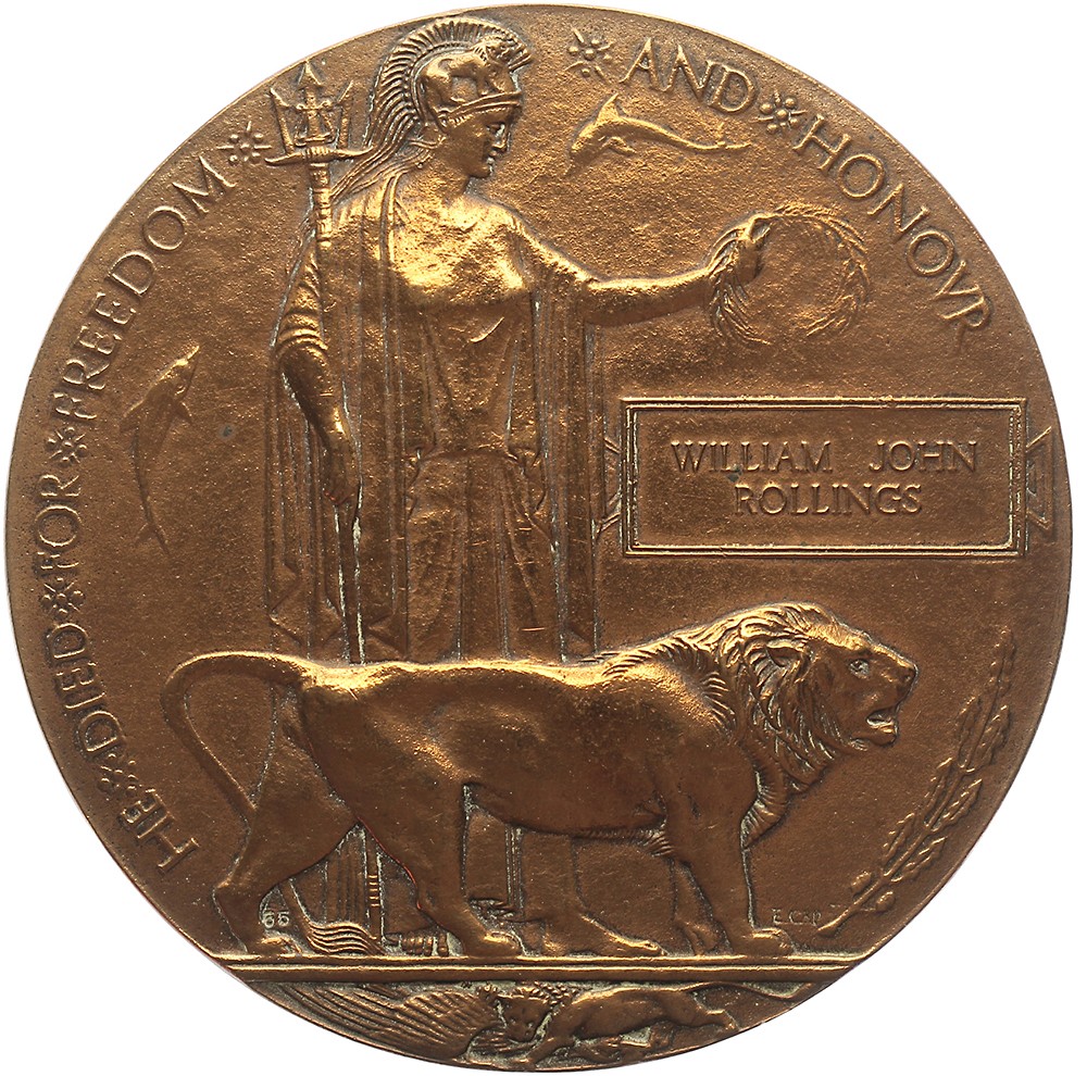 1919 First World War memorial plaque (Dead Man’s Penny). Britannia holding a trident and standing with a lion. Dedicated to William John Rollings. / Blank.Æ cast 121,5 mm., nr. 65 manufactured at the Royal Arsenal, Woolwich. Edw. Carter Preston. EF.