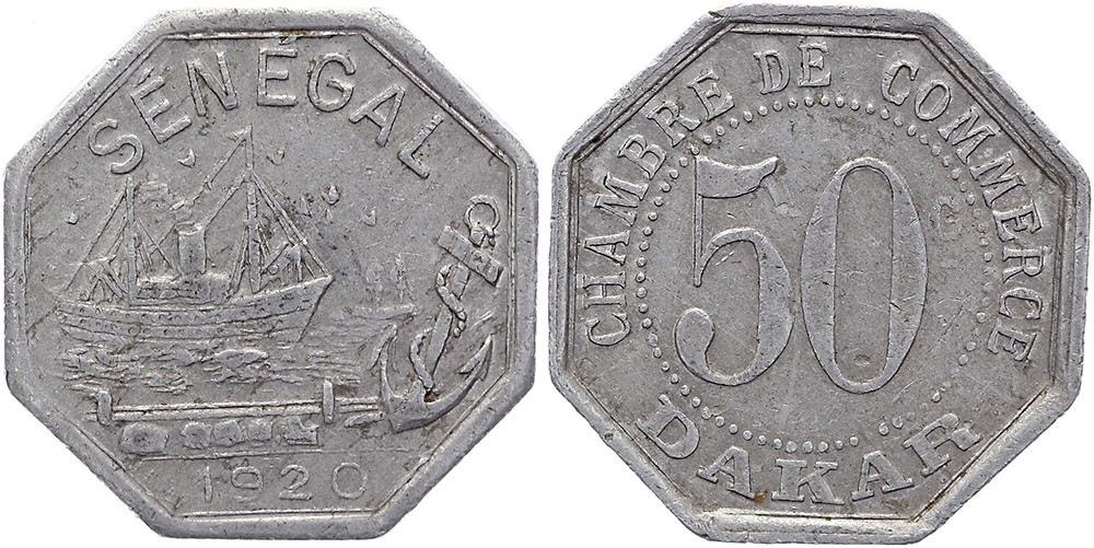 1920 Dakar, 50 (centimes) Chambre de Commerce. Aluminium octogonal 25. Gad./Ellie 1.4.; Lecompte 8. TTB.