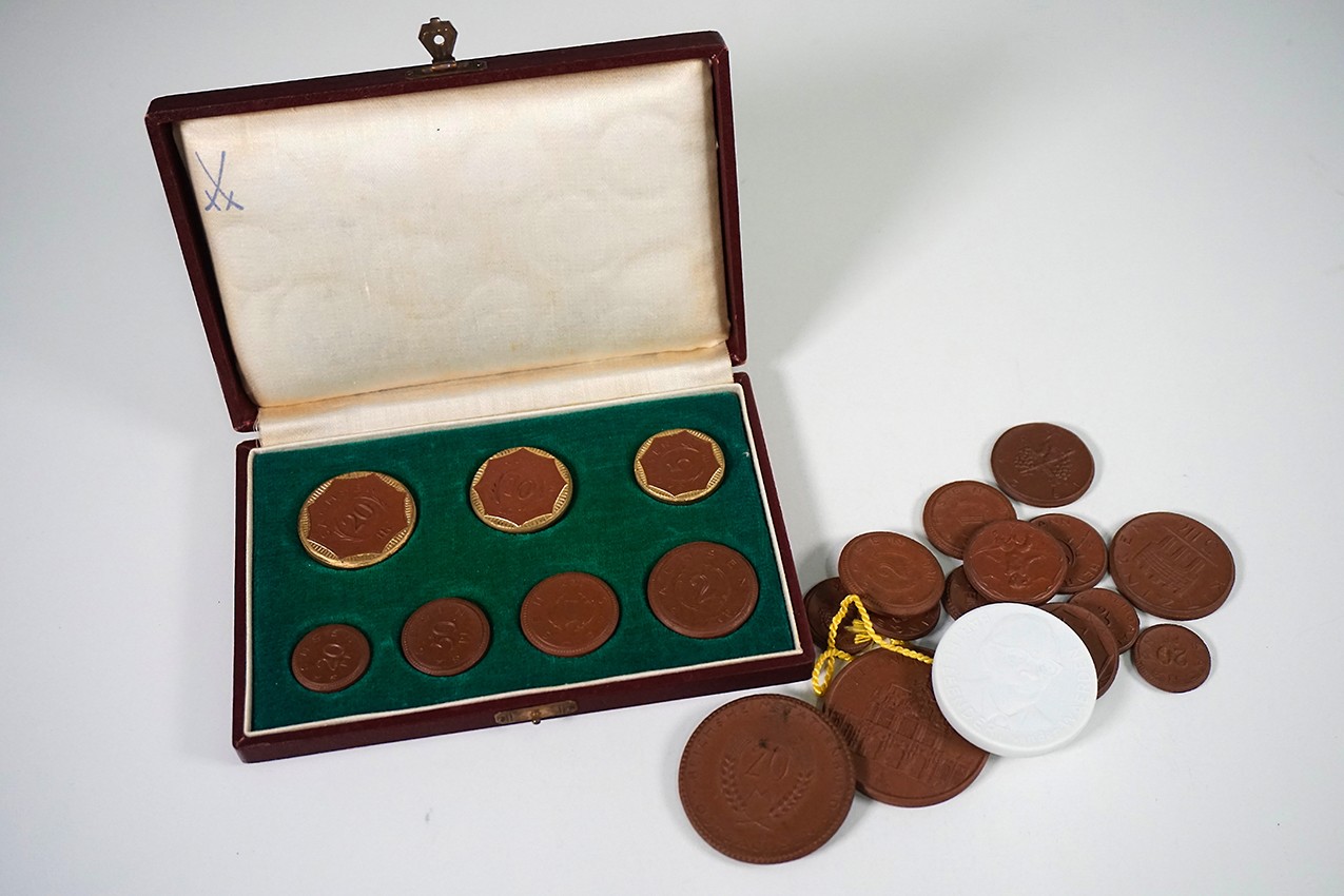 Langwerpig rood doosje (22) met porseleinen penninkjes uit Duitsland, waarvan 7 in originele cassette.